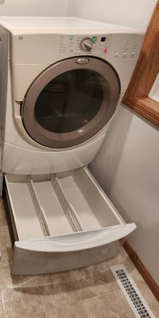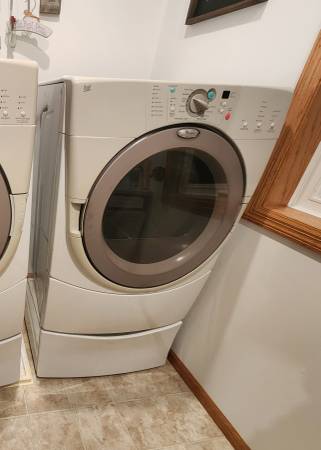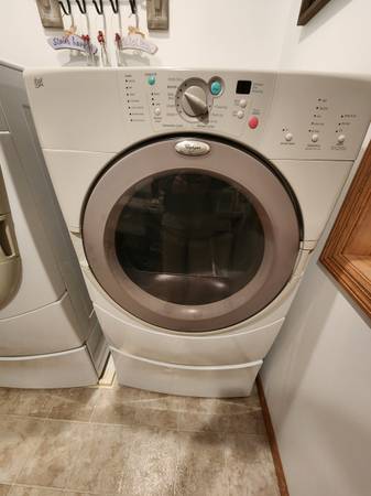 Whirlpool Duet electric dryer. It is clean and works good. Pet free home. Cord not included. Pedestal goes with it. Dryer: GEW9260PW1