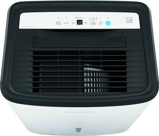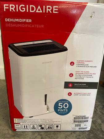 Frigidaire dehumidifier with built-in pump - New in Box Frigidaire 4,500 sq ft 50 pint capacity dehumidifier Built-in Pump can carry water away upward to a higher drain or a drain that’s farther...