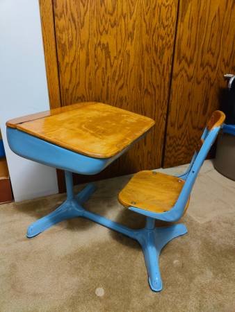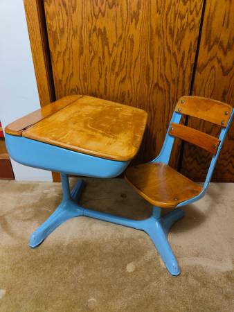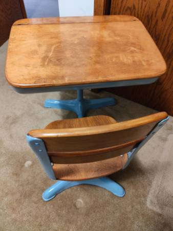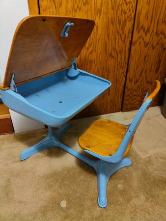 Vintage school desk, in very good condition, top lifts for storage, chair swivels, very solid, great for play school