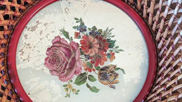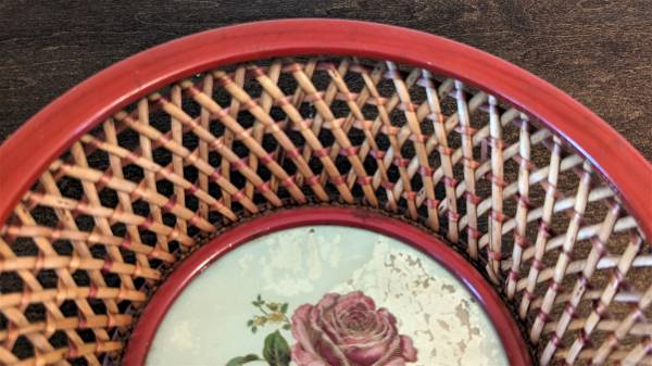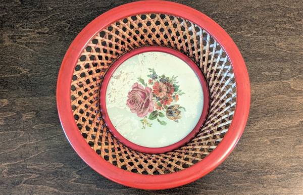 Authentic Made in US Zone, Germany (Post WWII). Red Wicker, Metal and Hand Painted Rose Design Basket/Bowl. 10” Across. Pick up in Owatonna. Cross posted.