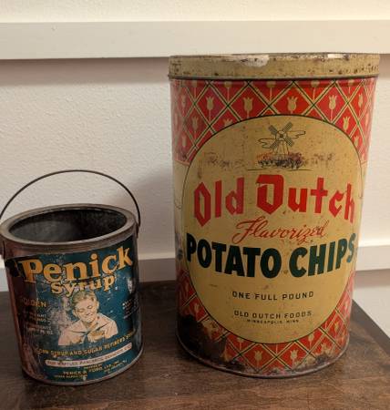 2 Old Metal Containers- Old Dutch Potato Chips & Penick Syrup. Pick up in Owatonna.