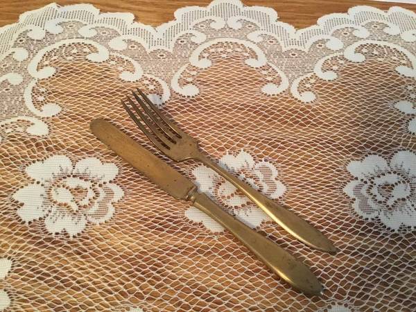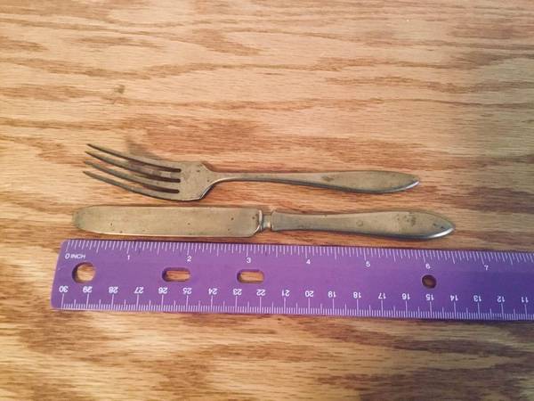 I have two pieces of flatware for sale, a fork and knife made by the Dirilyte Company. They are from the children’s set which included a spoon however I do not have the spoon. They are gold in color ~ there is no gold in them instead it is a bronze alloy for the finish. This set was made before 1961 as we used it in our home in the 1950’s. From what I have read about the company after 1961 they put a finish on the pieces so these are before that time.