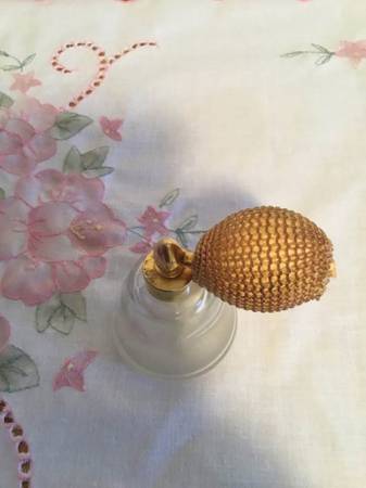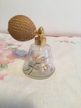Holmspray Perfume Bottle Vintage Painted pink flowers on glass About 3” tall 2” wide the spray atomizer is damaged so will need a new one $10 cash Pickup in Plainview 507-216-5 three three 4- no...
