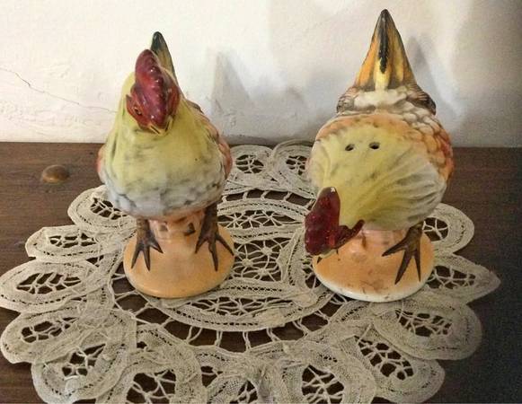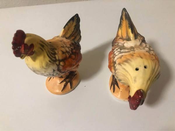 Lefton Rooster & Hen Salt & Pepper Shakers Salt and pepper shakers Vintage About 4” high $12 cash Pickup in Plainview 507-216-5 three three 4- no texting at this number