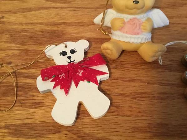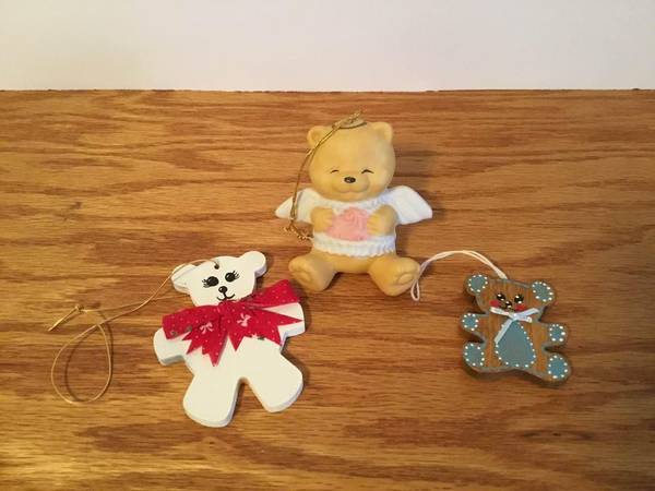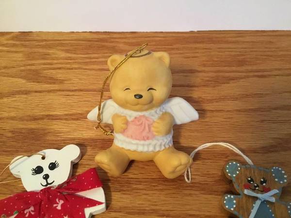 Three Teddy Bear Christmas Ornaments ~Ceramic pink angel design ~white wood red ribbon ~stained wood blue paint pick up at my home in Plainview 507-216-5 three three 4- no texting at this number $4