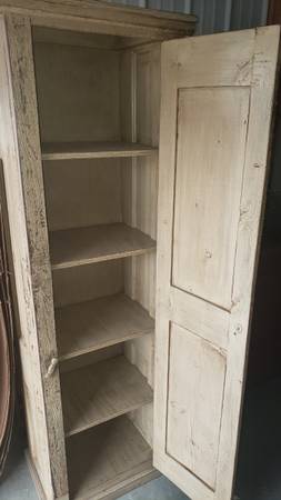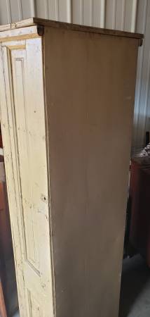 For Sale: A tall antique kitchen pantry cabinet or storage cabinet. Good condition with wear from age. It is 6 feet tall, 22 inches wide across the front and 15 inches long on the sides. Has four shelves on the inside.