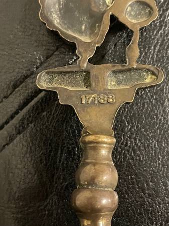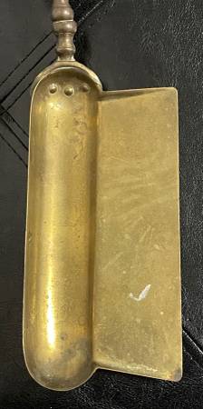 The item in the image is a silent butler, also known as a crumb catcher or ash catcher. This antique or vintage brass item was historically used to collect crumbs from a dining table or ashes from ashtrays.