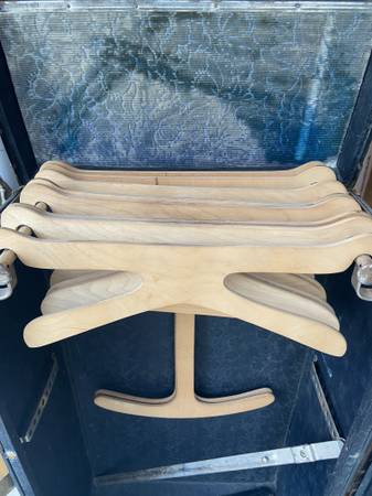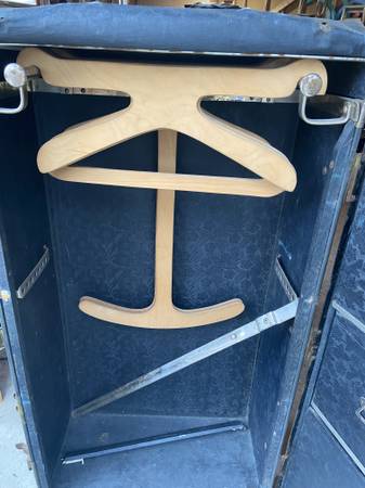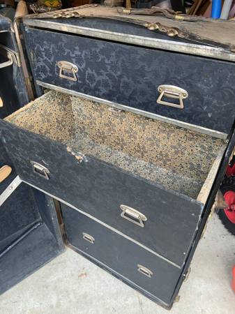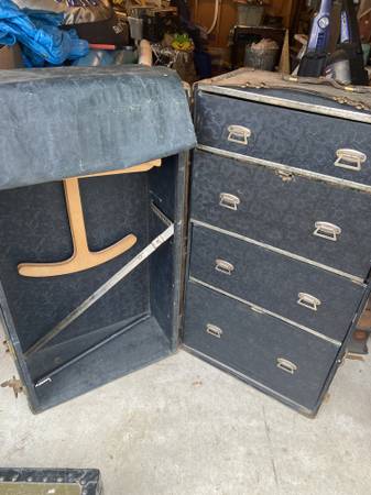 For sale. Antique steamer trunk, vertical standing, manufactured by Royal Trunk Company, wardrobe cushioned top model from the early 1900’s. Great color and patina, leave as-is or restore – art deco, check out etsy for decorating ideas. Solid condition, drawers are good and comes with original wooden hangers. Lock is broken, otherwise in good vintage condition. I have seen these on eBay for $400 as is to $2600 restored.
