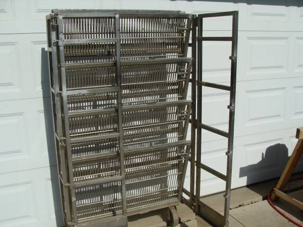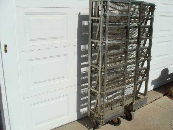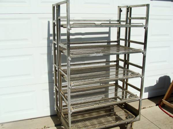 Has five 24" X 36" shelves. Stands 66" high X 26"deep X 39" wide. Folds up to 13"deep. Has 6" very heavy duty casters. Came from an Air Force base. Good condition, no rust. I will have a second unit...