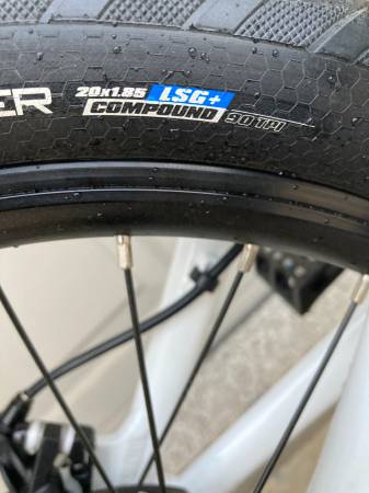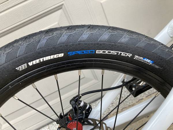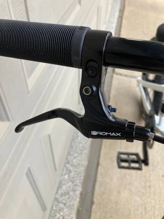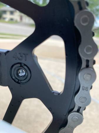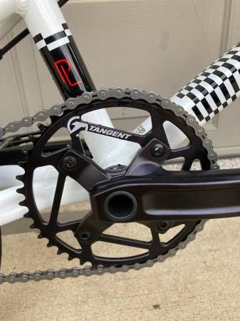 43/16 gearing with 20x1.85 Vee Speedboosters (100 psi) so it is very quick off the line. Tangent chainring, Pedaling Innovations Catalyst pedals, Answer Pro handlebar (8.5" rise), aluminum frame with chromoly fork.