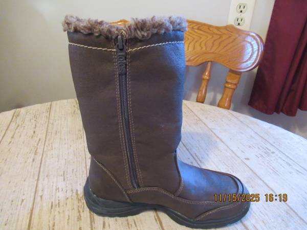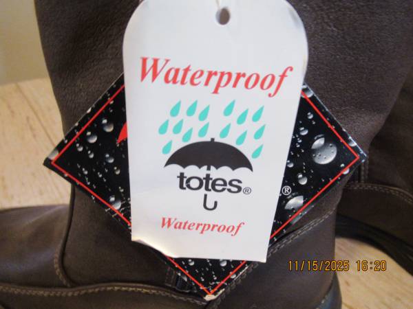 Brand new, tags attached, Totes brand winter/snow boots. Fur-lined, waterproof, and brown in color. Nice looking, fashionable boot. Size 6 medium.