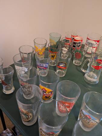Assortment of beer glasses for sale. Will throw in the Blatz light as a bonus. There are Old Style, Bud, Black Label, Grain Belt, Schlitz, and more. 39 Glasses and 1 pitcher.