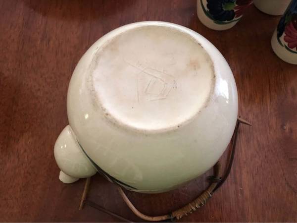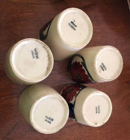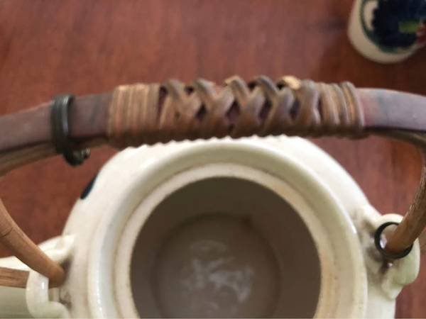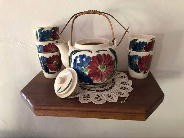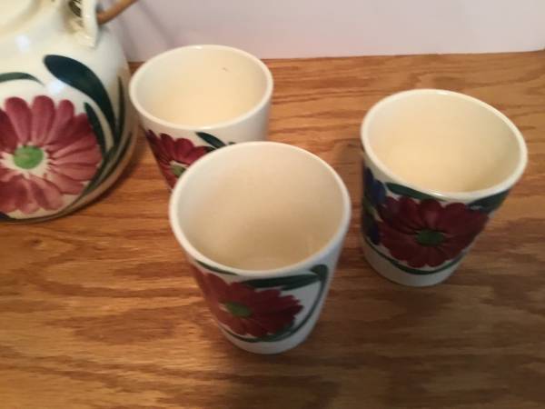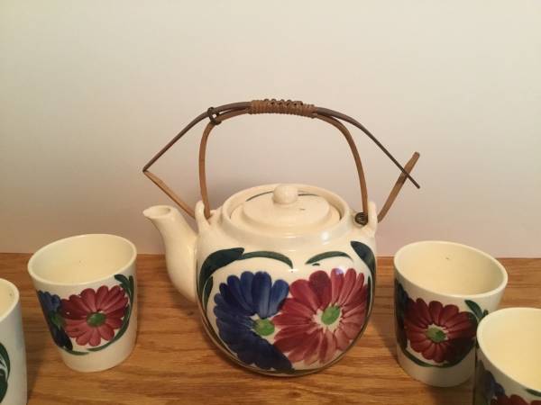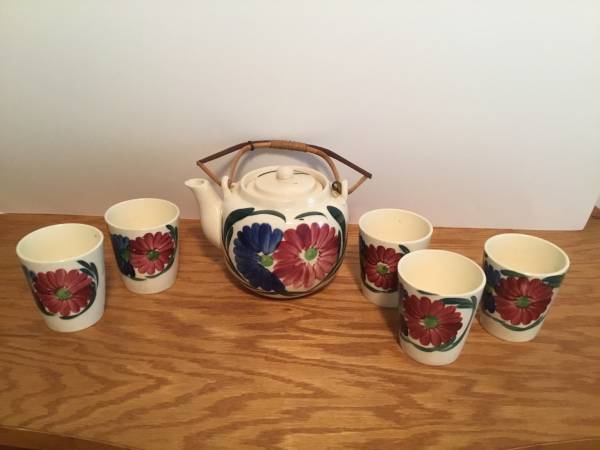 Hand painted ceramic teapot and 5 cups ~ made in Japan Mauve/blue/green floral design Teapot has wicker rattan or bamboo handle 5” tall Cups- 3” tall $15 cash Pickup in Plainview 507-216-5 three...