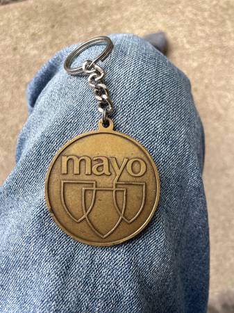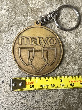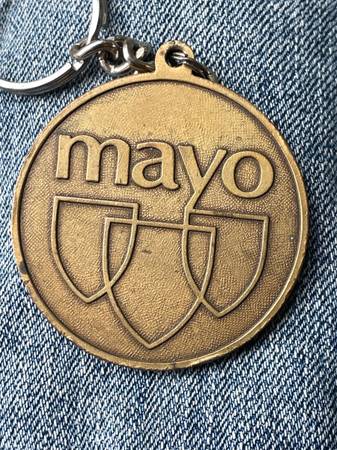 This appears to be a metal keychain featuring the Mayo Clinic logo.