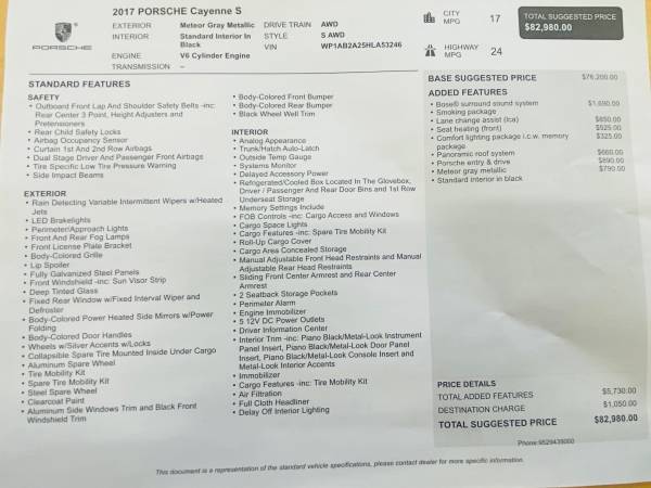 Showroom new 2017 Porsche Cayenne S AWD. I have a copy of the original window sticker showing ALL equipment. Vehicle is a blast to drive. Vehicle has 92000 VERY well kept miles. None nicer Ive seen. IF interested, please CALL Steve at 651-775-7284. Calls ONLY please because of scammers and thieves. Thank you.