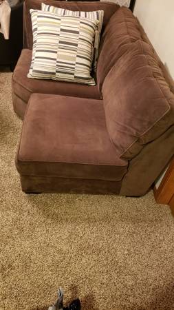 Dark Brown soft velvet like material. The cushions are removable . Total length 75", Larger section ~45" W; smaller section ~36"W. They are clipped together and can be rearranged for the space used. Not heavy to move. Pick up only. Comes with the two pillows.