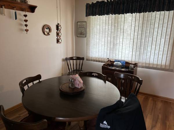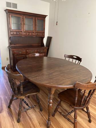 48" diameter table with two 11.5" wide leaves and four chairs.