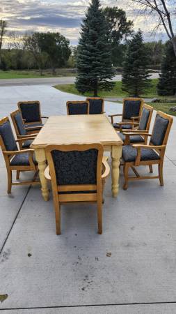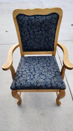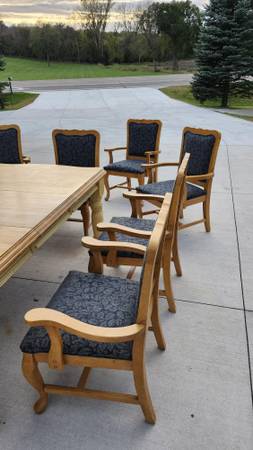 Very heavy solid butcher block farmhouse table with one leaf as show in picture. I had planned to refinish but have no time or space to store it. There are 9 armchairs with a navy blue and green leaf pattern, all very solid, no rips or worn areas on upholstery.