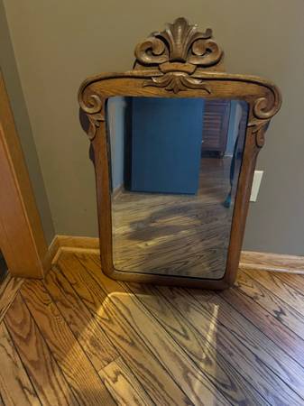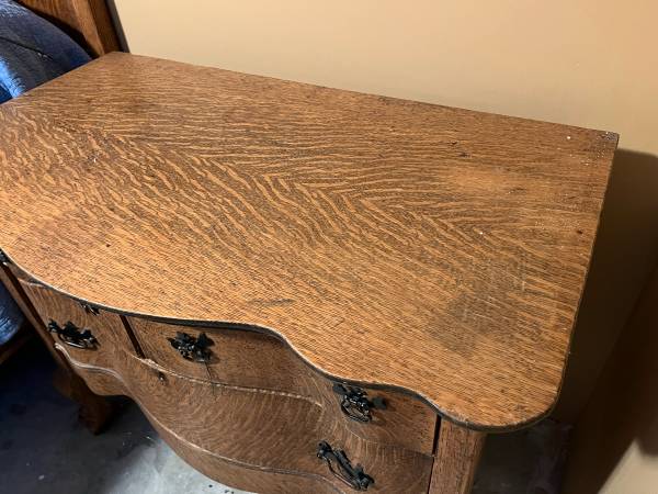 Antique dresser. Hardware loose and has water stain on top. Otherwise in good shape. Matching mirror available for $20 more. Matching smaller dresser available too (in separate post).