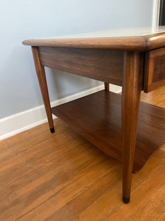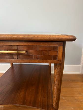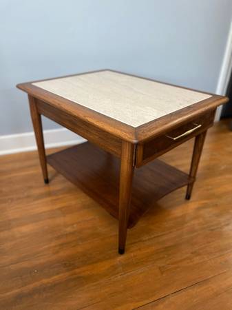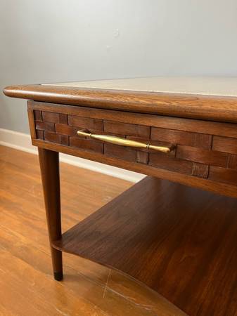 Newly-refinished MCM vintage side table with travertine top. This unmarked piece in the style of Lane’s “Perception” line is made of solid elm accented with walnut veneer, and has a travertine inset top. The striking basketweave drawer front is highlighted by a newly polished brass pull. The solid elm legs have the black painted “leg caps” which are typical of this style.