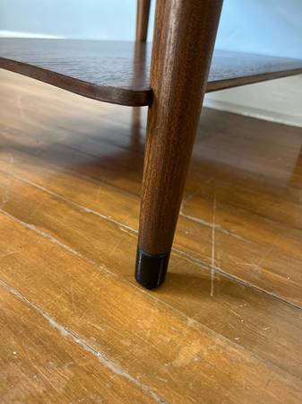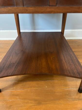 Meticulously refinished in a medium walnut colored stain and sealed with 4 coats of a hand-rubbed satin polyurethane for a buttery smooth, durable finish.