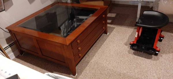 The table has three pullout drawers. The upper drawer displays under glass top.
