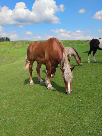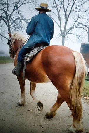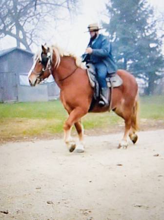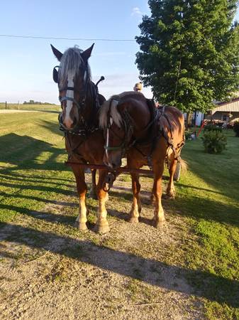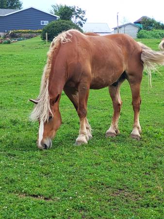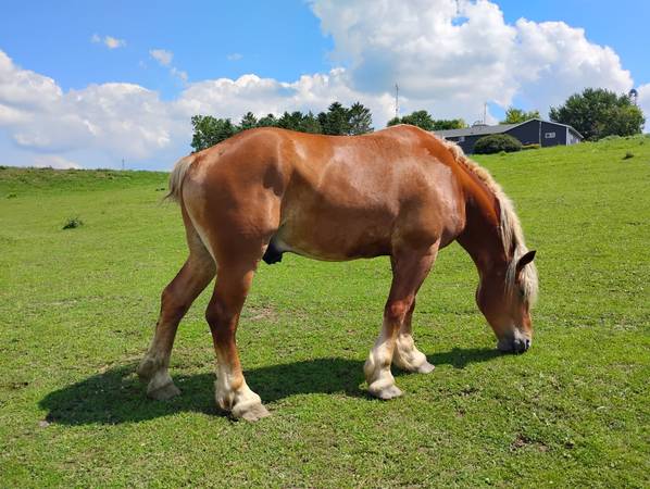 4 year old Belgian gelding, approx 17 hands, broke well double, been on most all farm machinery. Amish broke and been used on Amish farm. Friendly, sound and