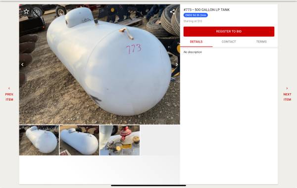 Selling at Graves November 30th online auction 500 gallon propane tank https://gravesonlineauctions.bidwrangler.com/ui/auctions/152401/22326424