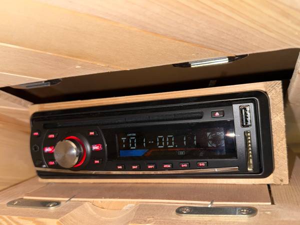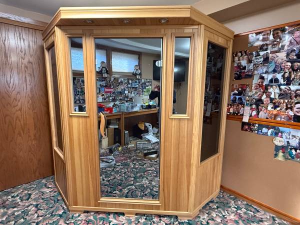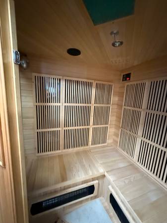 Our sauna seats 3 adults. It is a corner sauna in pristine condition. It saves on space due to it being a corner unit. The wood is Canadian Hemlock. 110V 20amp dedicated. With an Audio Entertainment Center (CD/FM Stereo MP#, Recessed interior lighting, Ceiling Vent, Chromotherapy Lighting, Oxygen Ionizer (Electronic Air Cleaner and Exterior Lighting.