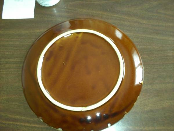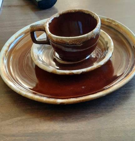 We have a nice brown dinnerware set. On the bottom is a leaf with Monmouth Ill USA on bottom of serving bowls. 12 PLATES 12 CUPS AND SAUCERS 2 SERVING BOWLS 1 SERVING PLATE NO CHIPS. NICE HEAVIER...