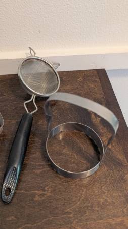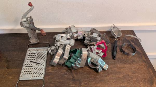 VTG. Ring of Cookie Cutters, shredder, can opener, scraper, etc. Pick up in Owatonna.