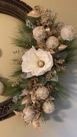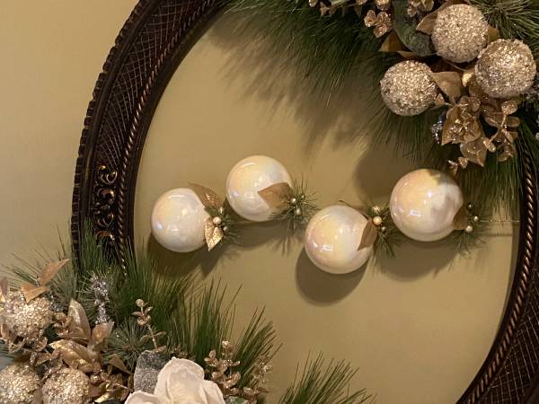 NEW Designed Large Brown/Bronze Framed Christmas Wall Hanging-High End Floral's, Greens-White Pine,Spruce, Magnolia Leaves, Berries, ect… Large White Magnolia’s, Iced Ornaments, Champagne Iced Leaves and Eucalyptus. Hanging down Decorated Iridescent Ball Ornaments.