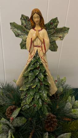 NEW Holly Angel Centerpiece/ Arrangement. Angel with Holly Wings and Skirt, Mixed Greens, Flocked Pines, Pinecones, Holly Berries. 16" Tall x 17" Wide/Round Great Hostess, Employee, Friends Gifts!...