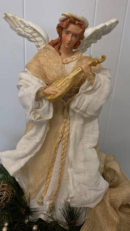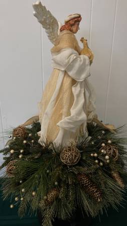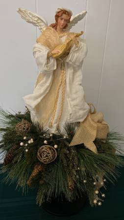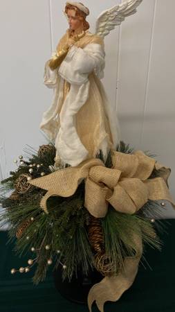 NEW- Large Beautiful Angel on Black Pedestal Centerpiece/Arrangement Mixed Greens, Pinecones, Grapevine Balls, Gold Shimmer, Berries, Gold Bow. 27" Tall x 16" Wide/Round Great Hostess, Employee,...