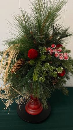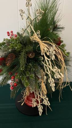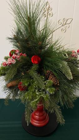NEW- Red Candle Holder 3 Metal Snowflake Centerpiece/Arrangement Mixed Greens, Flocked Greens and Berries, Pinecones, Raffia, Red Velvet Balls, 3 Metal Snowflakes. 24" Tall x 17" Wide Door Pick Up