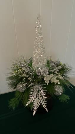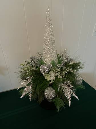 NEW- Silver Candle Holder with Sequence Tree Arrangement/Centerpiece Mixed Greens, Flocked Eucalyptus, Glitter Pinecones, Silver Balls, Silver Leaf Picks. 23" Tall x 17" Wide/Round Great Hostess,...