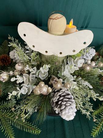 New Winter Snow Angel Centerpiece- in ceramic container. Contains Flocked pine cones, eucalyptus, berries, cedar and pine greens. Snow Angel holds a tea light candle which is included.