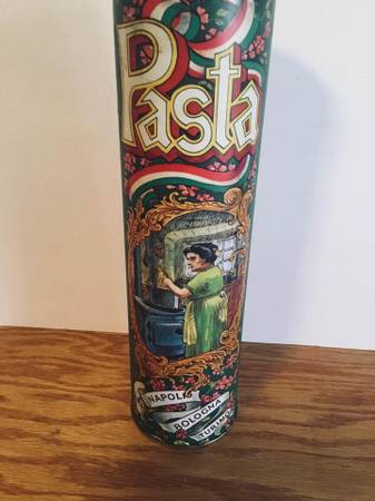Vintage Casa Via Variccio Pasta Tin Green Cylinder Tin for Pasta has an Italian theme design about 11" tall pick up at my home in Plainview 507-216-5 three three 4- no texting at this number $9
