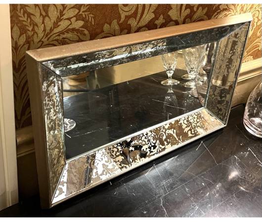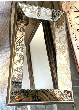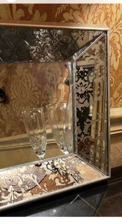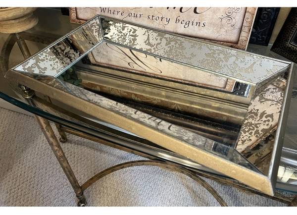 Framed Mirror Wall Art Serving Tray Table Top catch-all vanity organizer Formal classic gold floral damask detail Solid/ heavy Measures aprox: 20.25” wide 15” deep 2.5” high Felt-lined rear side...