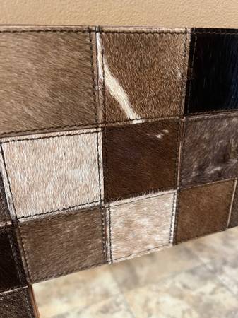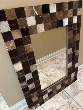 Gorgeous Leather Hair-on-Hide Patchwork decorative wall Mirror Unique / original Brown tones Fully wrapped quality strong/ sturdy Ready-to-hang hardware vertical or horizontal Measures...