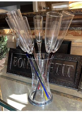 8 Hand Blown Colorful Crystal Long Stem Footless Baseless Champagne Flutes & Vase