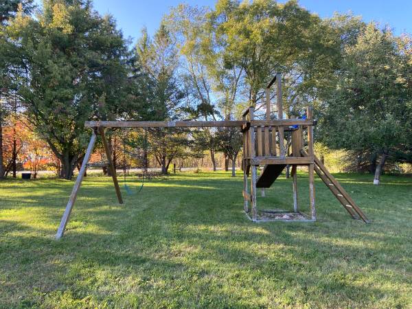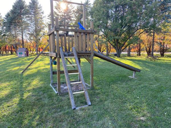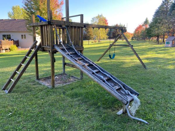 I have a Rainbow playset. It's used. It's a little rough but it's all there so it would be a great start for someone on a budget. If you have looked at playsets, you know what they cost. If you have looked at lumber, you know what it costs. I have all the parts including the slide (not pictured) baby swings (2), regular swings, and the swinging bar. This is a genuine Rainbow setup with the plaque. The cheap hardware and swings alone at Menards will cost you 10 times this. You can put the Rainbow plaque on anything you build and basically double the value. :-)