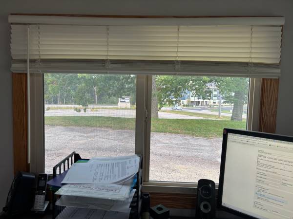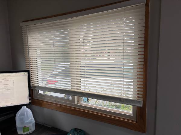 Window blinds. Some with strings, some that you pull up and down with internal strings. Many sizes. You haul. Bring tools to remove blinds.