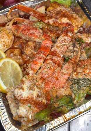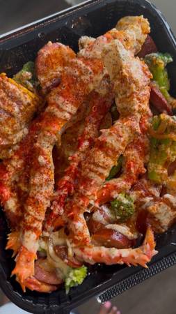 1 cluster of crab legs (or ~½ lb), corn, potatoes, sausage, butter sauce