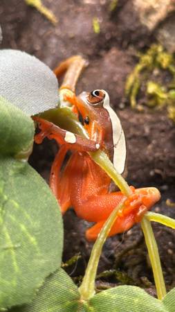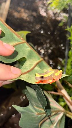 Super cool clown frogs!! Rare—and awesome pets! I have 3. Feeding on crickets. There is a fee, these guys are hard to come by.