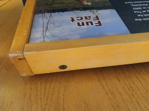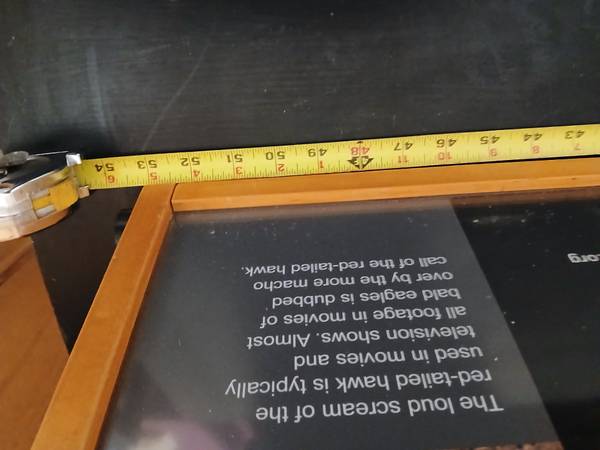 Framed informational photos with description of Red-Tailed Hawk. Heavy duty frame. Measures 53 x 16 x 2. Solid wood frame with 1 " tube steel. Solid backing on photos. Photos are one piece 53 x 16. Frame is easily disassembled for changing print, backing. Legs to stand up display.