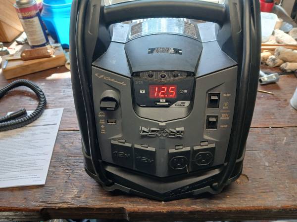 Schumacher SJ1332 6-in-1 1200 Peak Amp Jump Starter and Portable Power Station. Built for heavy-duty jump starting, the SJ1332 has enough power to jump start up to 8.0L gas or 6.0L diesel engines. It also serves as a portable power station perfect for tailgating, camping, and emergency use. A 200 continuous watt and 400 peak watt power inverter provides AC power to the two built-in 120V AC outlets. The SJ1332 also features two 12V DC accessory outlets for powering 12V appliances and a 2.0A USB port for USB devices such as smartphones, tablets, etc. An LED area light is perfect for providing emergency lighting or using the SJ1332 after dark. Turning the SJ1332 around, you’ll find a 150-PSI air compressor with an analog gauge,