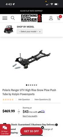 This is a Koplin mid-mount, high rise snow plow push tube. Was on a 2019 Polaris Ranger. Asking $250 obo. May be able to meet within 50 miles of Plainview. No plow blade.
