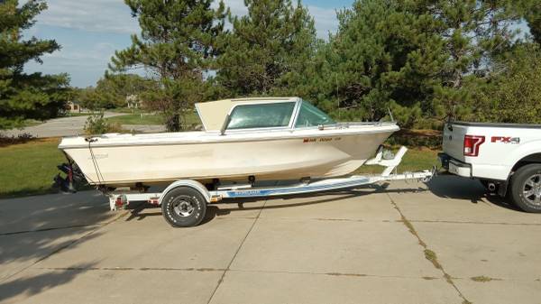 1971 Vintage Aristo Craft with Hardtop sliding roof on older white boat ,Red boat is an example of this classic beauty!! Chevrolet 4 cyl "Iron DUke" runs great,with Merc Cruiser. All working great. All gauges work great, lights,horn,radio,ship to shore radio as well,even depth finder still in boat. Very handy for unfamiliar waters.