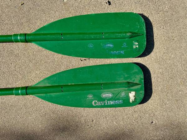 A pair of low-end canoe paddles. They seem fairly sturdy with a metal core in the shaft. They aren't special but I've seen many a worse paddle. They have held up well for many years of use, but we received some wood hand-me-down paddles recently and these were really too long for us, so it's time to prune our supply of extra paddles. Originally owned by a family of rather tall folks. You haul.